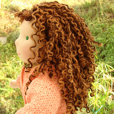 Bella bambolina waldorf fatta a mano, abbastanza grande. Ha l'acconciatura particolare - i capelli sono fatti di lana, che prima era una maglia, lavata e colorata con hennè naturale e poi disfatta.